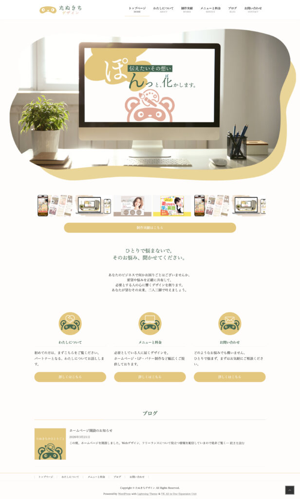 たぬきちデザインのホームページを制作しました。まずは訪問してくださった方が、親しみを持ちつつも思わずワクワクしてしまうような黄色をメインカラーとしています。また、見ていて情報が混乱して迷子にならないよう、シンプルな構造に仕上げ、どのような方でも直感的に情報を入手し、お問い合わせができるようなレイアウトにしました。お問い合わせ、ご相談、いつでもお待ちしております。