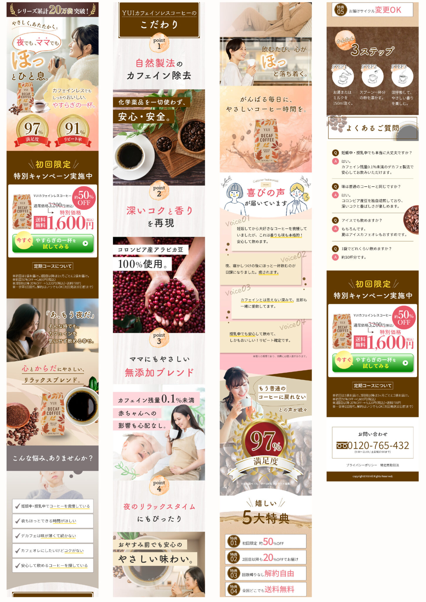 カフェインレスコーヒーのサンプルLPを制作しました。ママ世代の女性をターゲットに、優しく温かな雰囲気に仕上がるように工夫しました。数字や商品の強みとなる情報は明瞭にし、LPを見てくださった方が思わず購入したくなるようなデザインを施しました。また、情報量の多くなりがちなLPですが、次のページに自然と目が流れるようウェーブや明暗がはっきりした配色を施したりして、テンポよく閲覧できるようにし、最後まで見ていて飽きないような動線にしました。